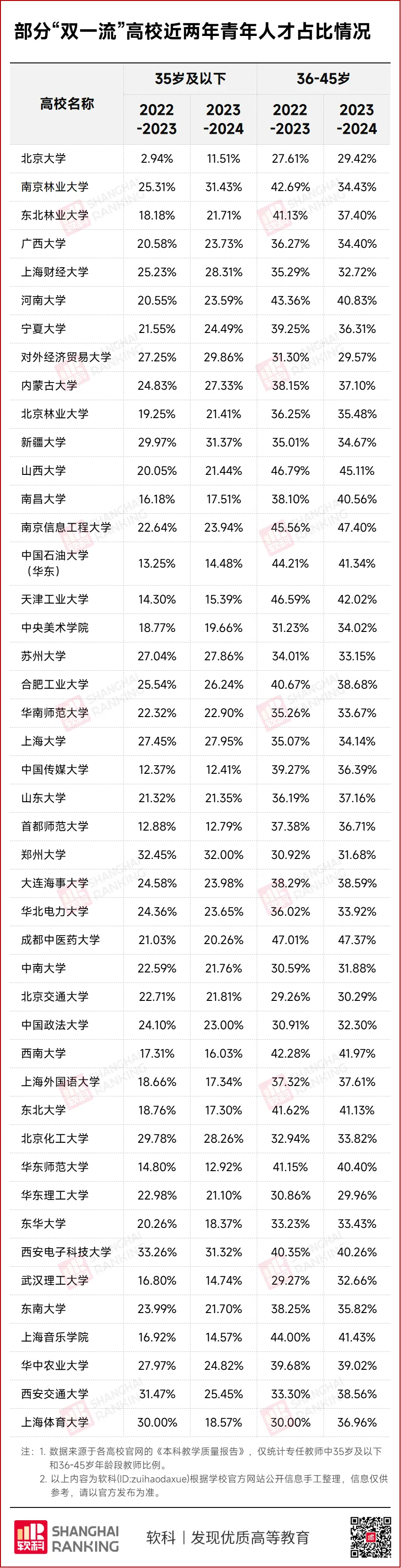 北京大学利用学校的国际合作交流网络,引进一批顶尖领军人才和优秀青年人才,青年人才在专任教师的比例数显著提升。其中,35岁及以下的专任教师占比由22-23年的2.94%上升到23-24年的11.51%。