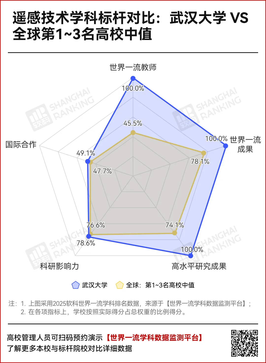 与该学科全球Top3高校的中值相比,武汉大学在遥感领域的强大统治力更得以体现——学校得分全方位超越上述标杆群体。