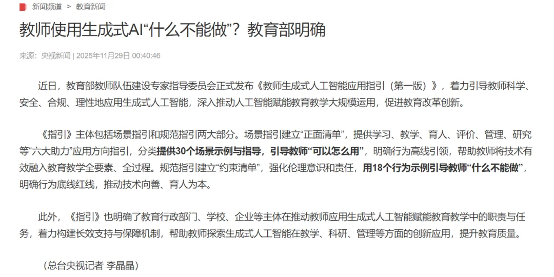 因此,《指引》的出台,旨在通过明确的制度供给,将这种自发的、零散的技术探索,引导至科学、理性、合规的轨道上来,既赋予了教师利用AI进行语法检查、句式优化及个性化教学支持的权利,明确了技术赋能的合法性,又为日益普及的AI应用确立了统一的行为标尺,确保技术红利在教育场域内的有序释放。