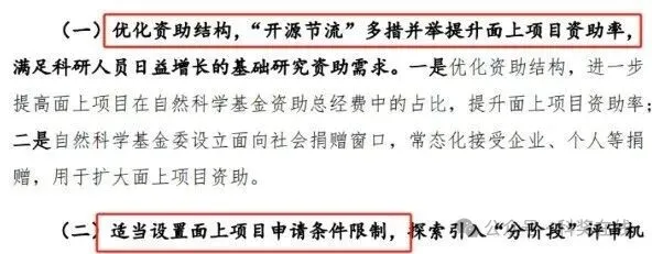 随着博士数量逐年增多、自主人才培养力度加大以及海归人员不断加入等因素,不难预料,2026国自然申请需求仍会持续上升,要是以往的资助格局保持不变,面上项目的资助率可能会创下历史新低。 这也就意味着,在资源有限的情况下,许多同样优秀的项目会因为 “名额限制” 而失败,这无论是对申请人个人,还是对科研群体乃至整个科研领域,都是不小的损失。“提高资助率”,不仅是广大科研人员的共同愿望,也是科学基金为挖掘更多具有创新潜力的项目而急需解决的问题。 在总体预算增长有限的背景下,有三个解决思路:一是降低平均资助强度,二是提高 “面上” 项目的经费分配比例,三是控制申请量的持续增加。不过,2024 年为了让资助率保持在合理范围,平均资助强度已经有所降低。如果继续降低资助强度,项目质量恐怕会受到影响。 基金委显然早已考虑到这些情况,在最新的报告中,提出的优化建议包括 “增加经费分配” 和 “适当设置申请条件限制” 等方面。 前者是常规的解决办法,而后者则不太常见,但部分申请人对于 “限项” 的呼声确实不低。之前就有不少学者提出每人限3项面上项目的说法。那么,面上项目的 “申二停一” 会重新实施吗?还是会有其他形式的 “限项” 措施呢?现在都只能静待官方指南发布。