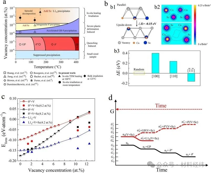 二是通过固态相变吸收空位。理论上,空位可以作为“化学”组分参与某些相变,降低能垒。这一路径此前在抗辐射铝合金设计中尚未被探索。