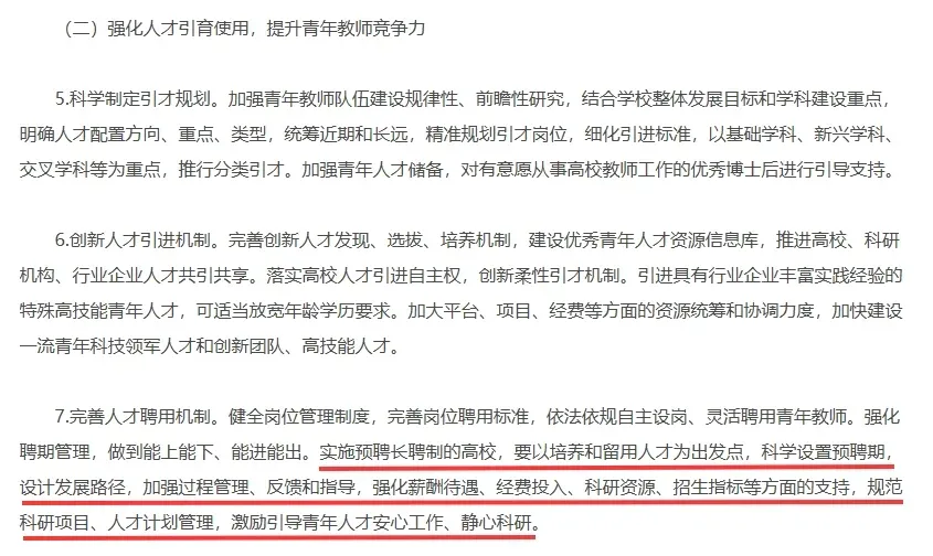 值得关注的是,在“完善人才聘用机制”的要求中,《指导意见》针对实施预聘长聘制的高校提出,“要以培养和留用人才为出发点,科学设置预聘期,设计发展路径,加强过程管理、反馈和指导,强化薪酬待遇、经费投入、科研资源、招生指标等方面的支持,规范科研项目、人才计划管理,激励引导青年人才安心工作、静心科研”。
