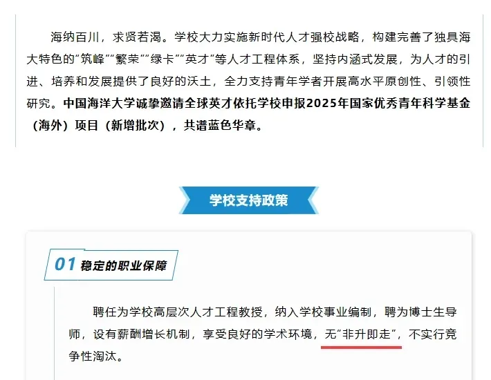 《中国海洋大学诚邀全球英才申报国家优青(海外)项目(新增批次)》中明确,聘任为学校高层次人才工程教授,纳入学校事业编制,聘为博士生导师,设有薪酬增长机制,享受良好的学术环境,无“非升即走”,不实行竞争性淘汰。