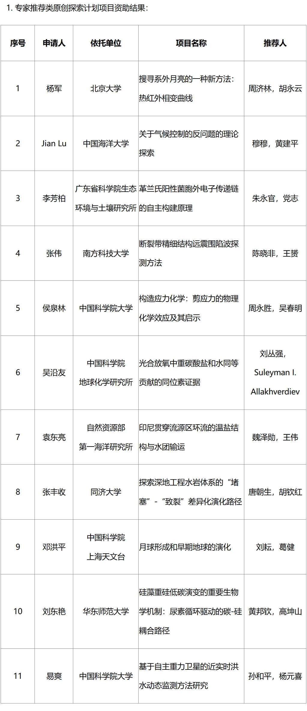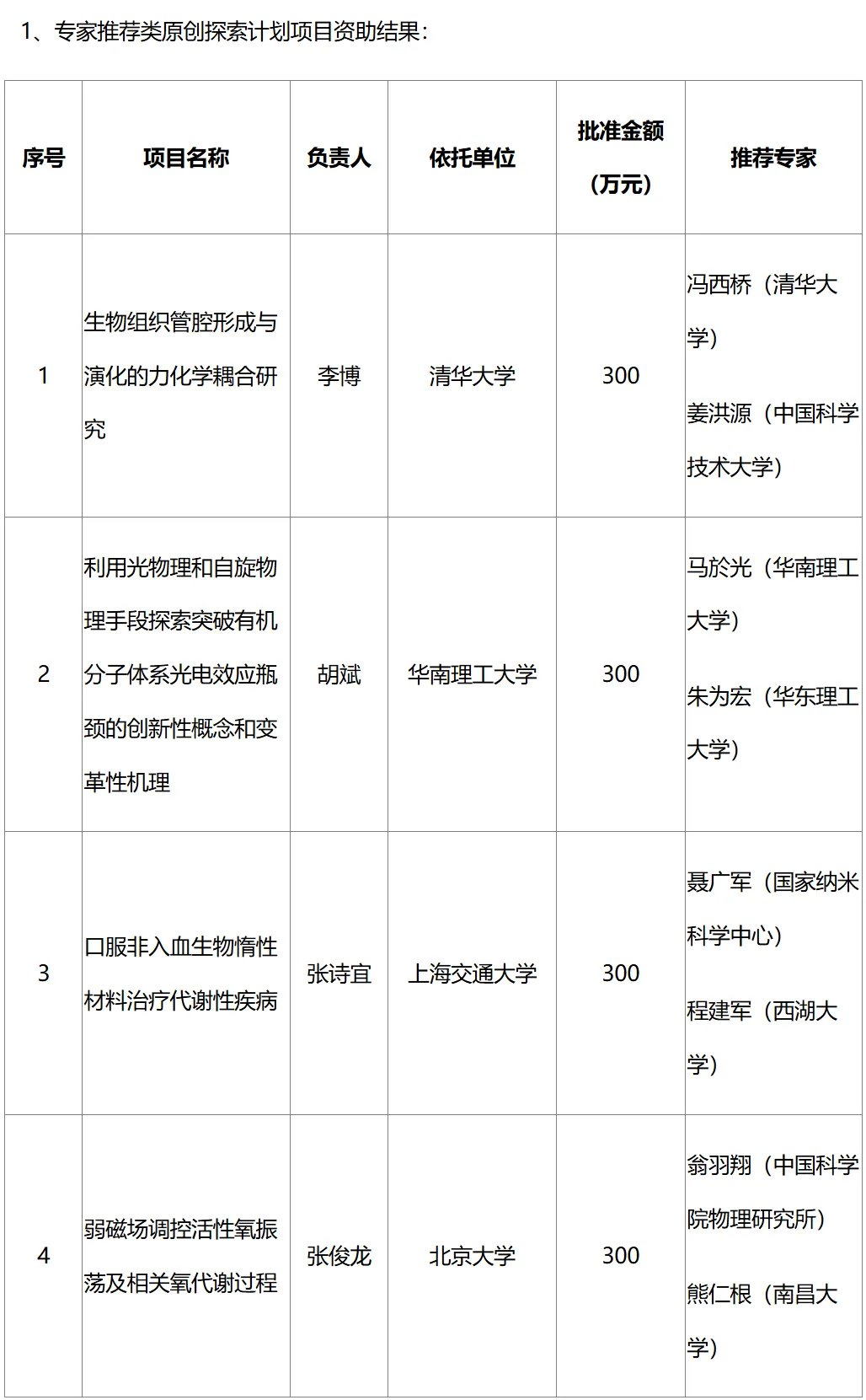 1. 专家推荐类原创探索计划项目资助结果: