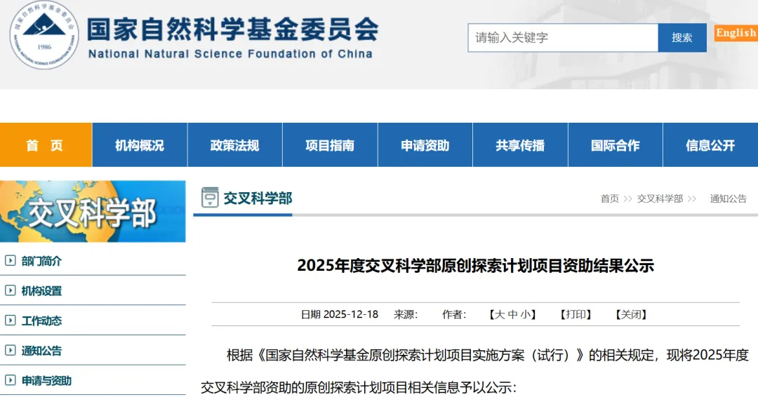 2025年度交叉科学部原创探索计划项目资助结果公示