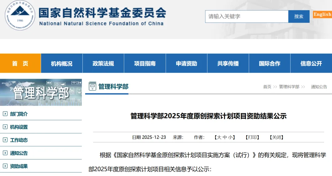 2025年度管理科学部原创探索计划项目资助结果公示