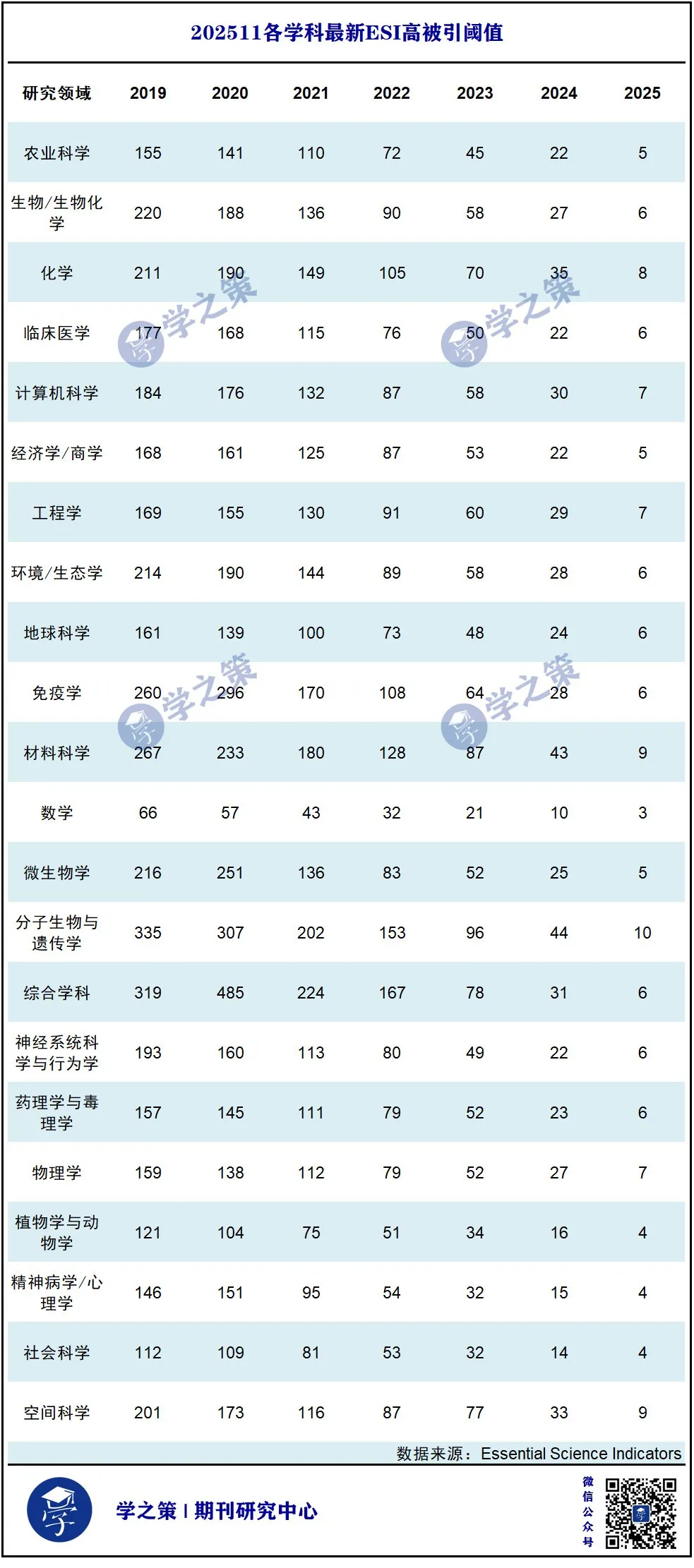 北京时间1月8日,科睿唯安官方发布了最新的ESI高被引阈值,覆盖了从2015年1月1日到2025年10月30日的数据。