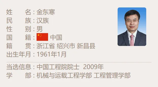 公开资料显示,金东寒生于1961年1月,浙江绍兴人。其职业生涯长期专注于船舶动力系统的研究与领导工作。他于1978年进入武汉水运工程学院(现武汉理工大学)学习,先后获得学士和硕士学位,1989年从中国舰船研究院获得博士学位。2004年2月,金东寒出任中国船舶重工集团公司第七一一研究所所长兼总工程师,该所是中国舰船柴油机及动力系统研发的核心科研机构。因其在动力机械工程领域的突出贡献,金东寒于2009年当选为中国工程院院士,隶属于“机械与运载工程学部”。曾于2005、2006年连续2年获国家科学技术进步奖一等奖,2009年获国家科学技术进步奖特等奖。
