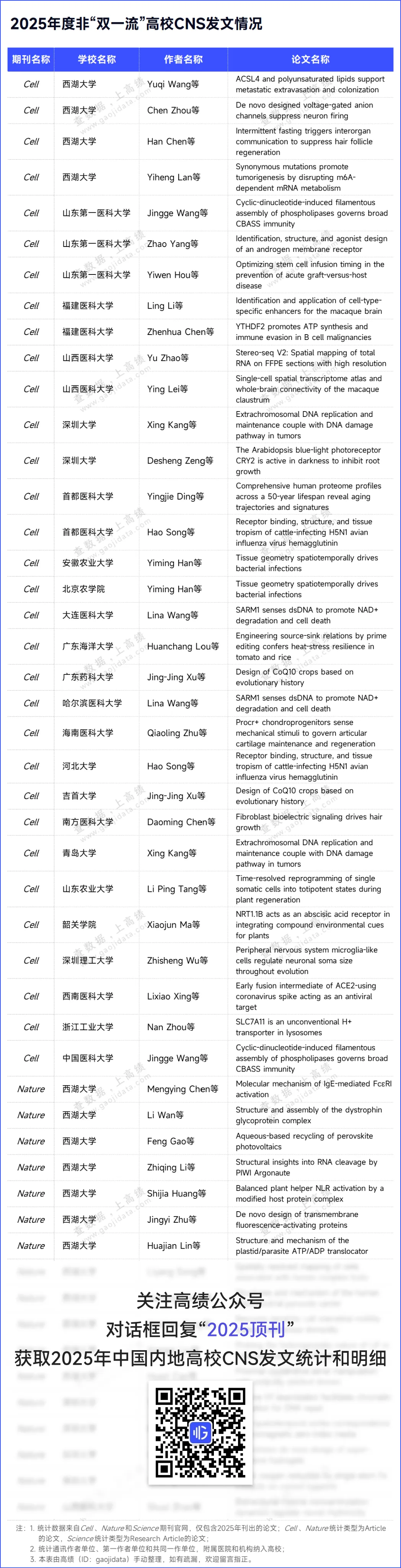高绩(ID:gaojidata)也整理了2025年度非“双一流”高校的CNS发文明细,供各位读者参考。
