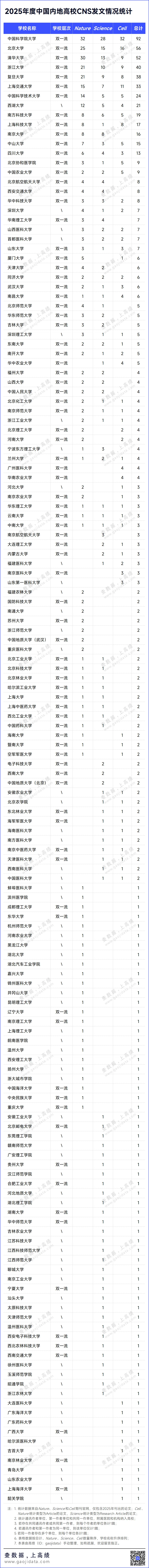 高绩(ID:gaojidata)统计了2025一整年以来,中国内地高校作为通讯作者单位(含共同通讯作者单位)或第一作者单位(含共同第一作者单位)在三大国际顶刊:Cell、Nature和Science(简称CNS)期刊,总计刊出的原创论文情况,以总结与展示一年来高校在国际科研创新领域的突出贡献。