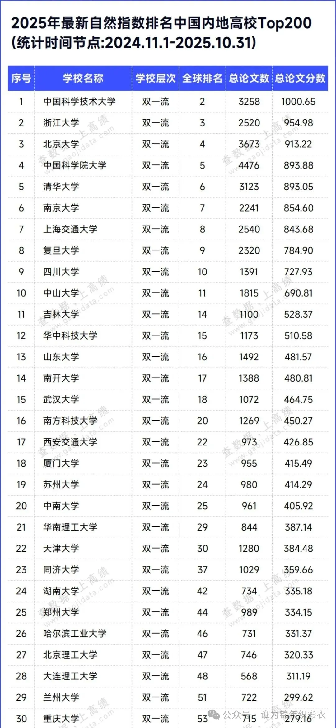 而排在内地高校第二和第三位,世界高校第三和第四位的则是浙江大学和北京大学。浙江大学在仅有2520篇数量的基础上,获得了954分的高分,距离千分高校也仅仅只有一步之遥,未来浙大能否凭借着2500篇论文的规模突破千分大关?就请我们继续拭目以待吧。