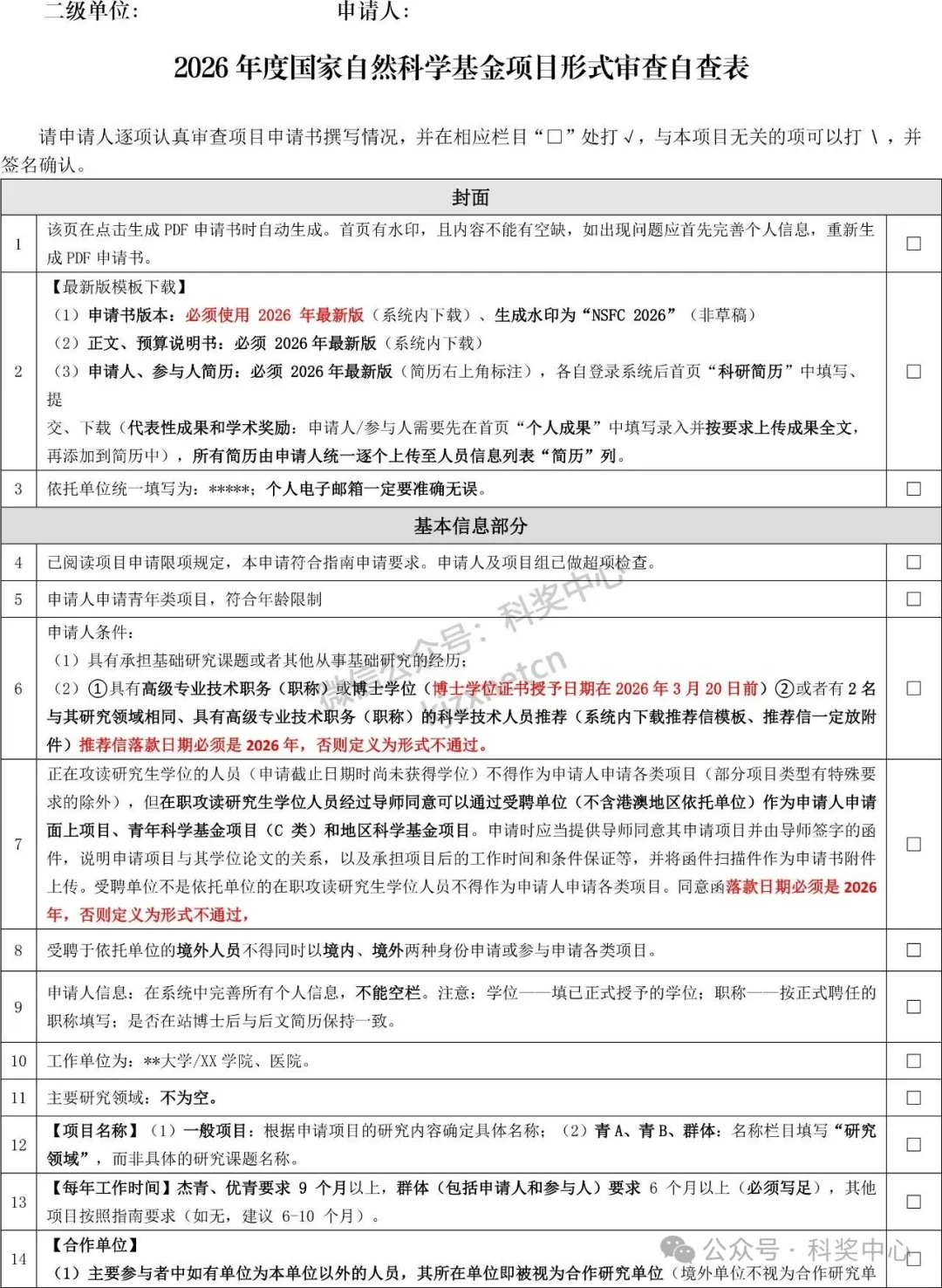 科奖中心从多所高校下载整理了两份2026年度国家自然科学基金项目形式审查自查表,请申请人自行下载打印自查。