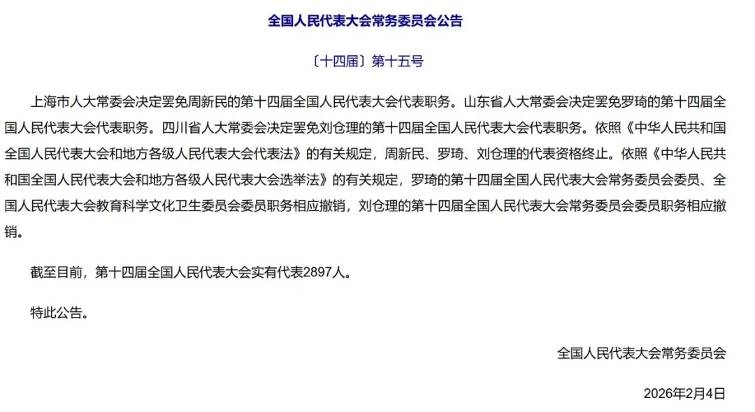 据新华社报道,2月4日,全国人民代表大会常务委员会发布全国人民代表大会常务委员会公告〔十四届〕第十五号: