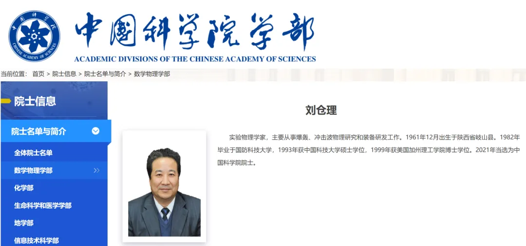 刘仓理是实验物理学家,曾任中国工程物理研究院院长(副部长级),主要从事爆轰、冲击波物理研究和装备研发工作。2021年当选为中国科学院院士。
