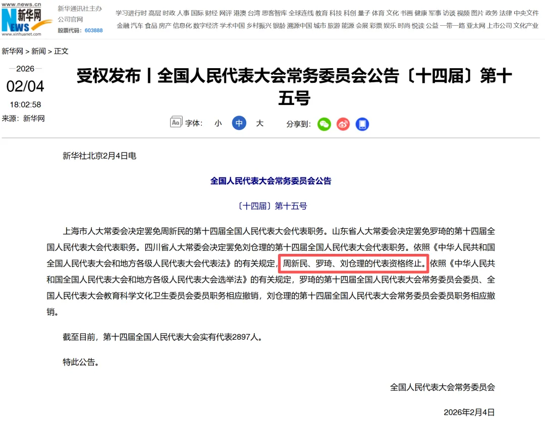 新华社北京2月4日电,据全国人民代表大会常务委员会〔十四届〕第十五号公告,周新民、罗琦、刘仓理的全国人民代表资格终止。