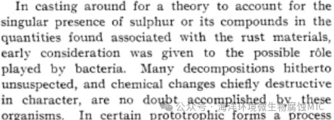 1934 年von Wolzogen Kühr和van der Vlugt的研究确定 SRB 是北荷兰富含硫酸盐土壤中广泛出现的铁管故障的主要原因。作者提出了一种纯粹的无机营养微生物过程,其中铁是唯一的还原当量。他们将微生物腐蚀归因于一种显著的生理特性,即 SRB 将阴极氢作为唯一的电子供体。这种机制解释后来以经典“阴极去极化理论”而闻名。