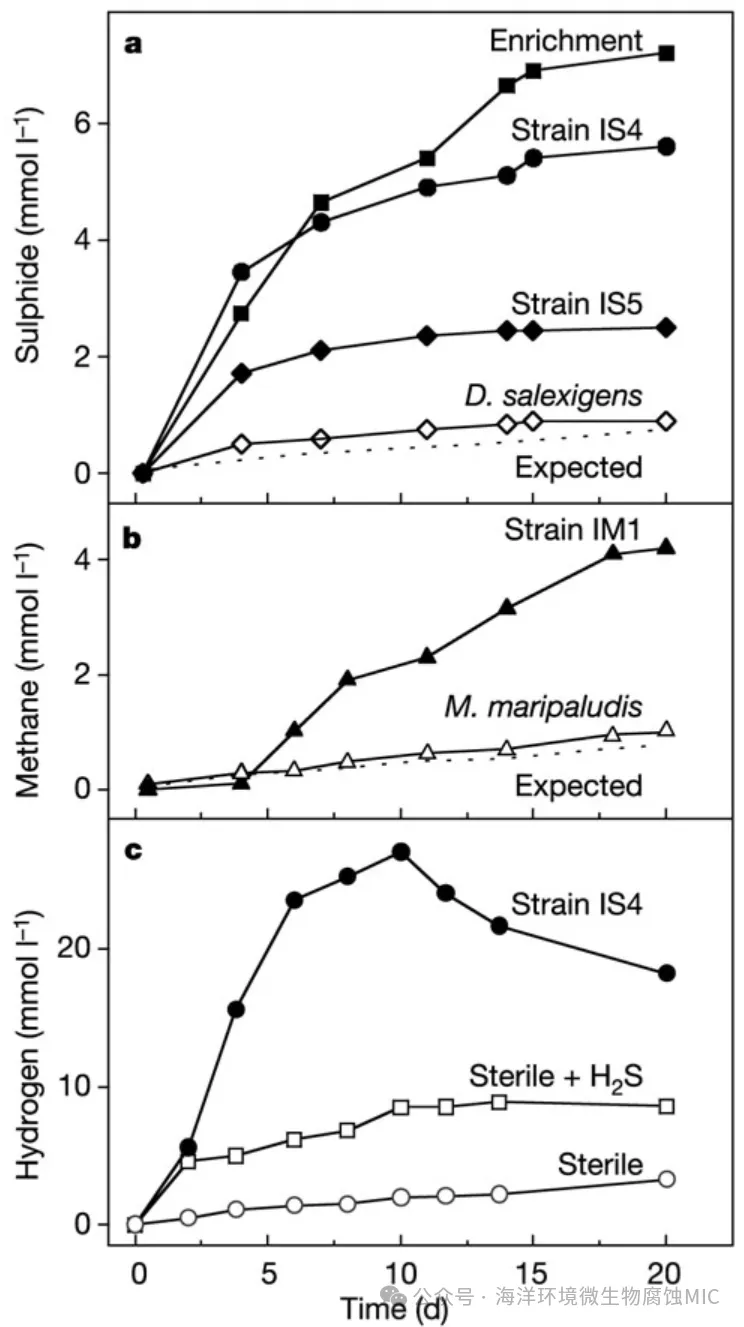 虽然到目前为止,仅在数量有限的高腐蚀性 SRB 分离物中观察到了 EMIC,但从定义上讲,如果存在硫酸盐和合适的电子供体,所有 SRB 都能通过排泄化学物质 H₂S 来影响腐蚀(即 “化学微生物影响腐蚀”,CMIC)。综上所述,SRB 可作为厌氧铁腐蚀的直接或间接催化剂(分别对应 EMIC 和 CMIC),并且在这方面存在物种特异性差异。