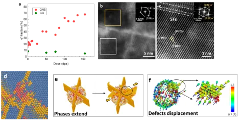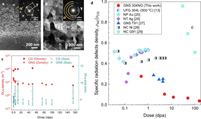 过去几十年来,核能因其高能量密度与低碳排放特征,被认为是缓解全球能源与环境压力的重要选项之一。为了安全使用核能,结构材料必须在核反应堆服役期间保持可靠性。与此同时,延长现有核电站寿命的需求,使材料在未来极端辐照环境中的服役时间显著拉长,因此开发更高抗辐照能力的结构材料成为近年的研究重点。 晶界(GB)对增加抗辐射性的作用已经由实验和模拟揭示。受这些工作的启发,纳米晶(NC)材料也因此受到关注。但纳米晶体系在较低剂量下可能发生晶粒长大,因此在NC材料中通过GB捕获缺陷的改善是有限的。此外,另一类方法利用纳米颗粒与基体界面捕获缺陷,代表为氧化物弥散强化钢,但受制于制备效率与批次稳定性。此外,高熵合金等单相浓缩固溶体体系被认为具备抗辐照潜力,但仍面临成本与高温高剂量稳定性方面的约束。 更重要的是,抗辐照不仅要降低缺陷密度,还要避免缺陷吸收与微结构演化对力学性能造成显著削弱,因此兼顾缺陷抑制与性能保持的协同策略尤为关键。在此背景下,中国科学院金属研究所与山东大学、中国科学院近代物理研究所、辽宁材料实验室团队合作,结合实验与分子动力学模拟发现,梯度纳米结构奥氏体不锈钢在极高剂量与高温辐照下仍表现出优异抗辐照能力,并提出由大尺度相变主导的缺陷持续耗散机制,为先进核结构材料设计提供了新的思路。该工作以《Improved radiation resistance in metals via adaptive martensitic transformation》为题,发表《Nature Communications》上。