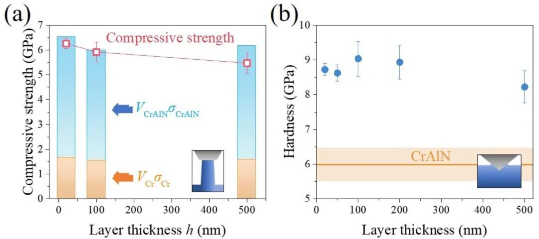 图4. (a)微柱压缩试验中获得的压缩强度,图中也标注了计算的流变应力;(b)样品的纳米压痕硬度。