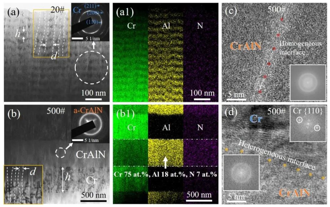 图1. Cr/CrAlN纳米层状材料的结构特征:(a)和(a1)20#样品的横截面TEM图像及对应EDX元素分布图;(b)和(b1)500#样品的横截面TEM图像及EDX元素分布图。插图为对应的选区电子衍射图;同质界面在(a)和(b)中显示为亮条纹,如虚线所示;(c)和(d)500#样品中同质界面和异质界面的高分辨TEM图像。插图为对应的FFT图像。
