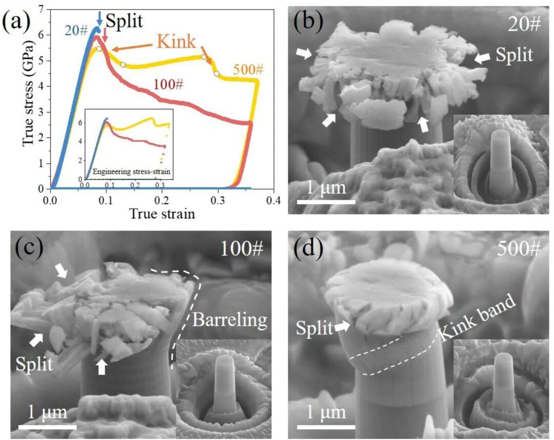 图3. (a)20#、100#和500#微柱的真实压缩应力-应变曲线。插图为工程应力-应变曲线;(b-d)压缩后微柱的SEM图像。插图为压缩前的微柱形貌。