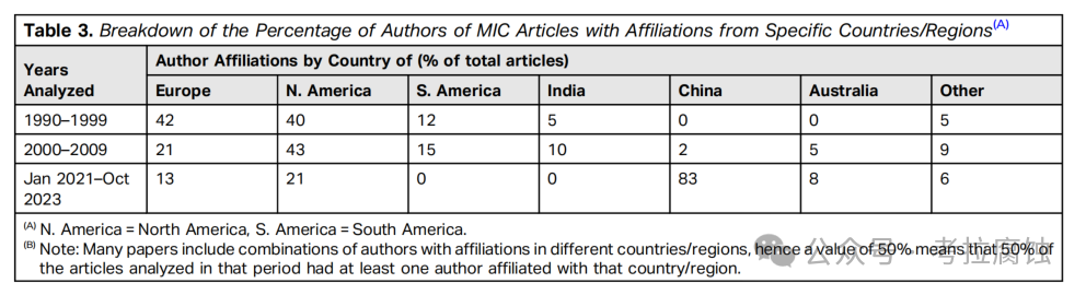 在目标期刊中MIC文章作者所属国家随时间也有重大变化(见表3)。1990s基于欧洲和北美机构的作者主导报告,结合占发表论文82%。然而,近期有大规模转变,近期分析期(2021年1月至2023年10月)约83%文章至少有一位基于中国机构的作者。大约64%这些近期文章所有作者与中国机构相关。虽然北美作者论文百分比保持合理一致,但欧洲、南美和印度作者数量显著下降。