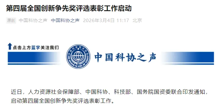 据中国科协3月4日消息,近日,人力资源社会保障部、中国科协、科技部、国务院国资委联合印发通知,启动第四届全国创新争先奖评选表彰工作。