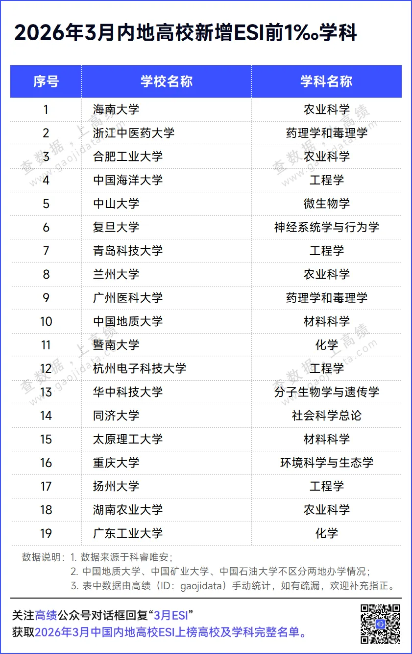 据统计,本次有388个学科进入ESI前千分之一。与2026年1月相比,19所高校共新增19个前1‰学科。