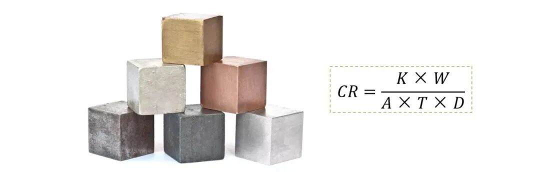 CR - corrosion rate(腐蚀速率); K - a constant for units conversion(转换常数K); T - time of exposure in hours(实验周期,h); A - exposed surface area in cm^2 to the nearest 0.01cm^2(暴露面积,精确到0.01cm^2); W - mass loss in g, to the nearest 1mg(失重,精确到1mg); -