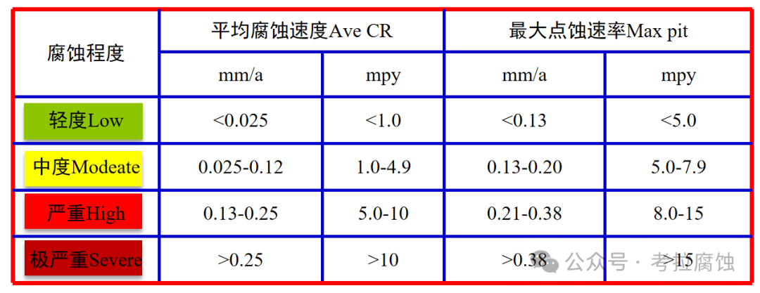 分为四个类型,分别是轻度(Low)、中度(Modeate)、严重(High)、极严重(Severe); 平均腐蚀速率分别是: Low,<0.025 mm/a; Modeate, (0.025~0.12) mm/a; High, (0.13~0.25) mm/a; Severe, >0.25mm/a。