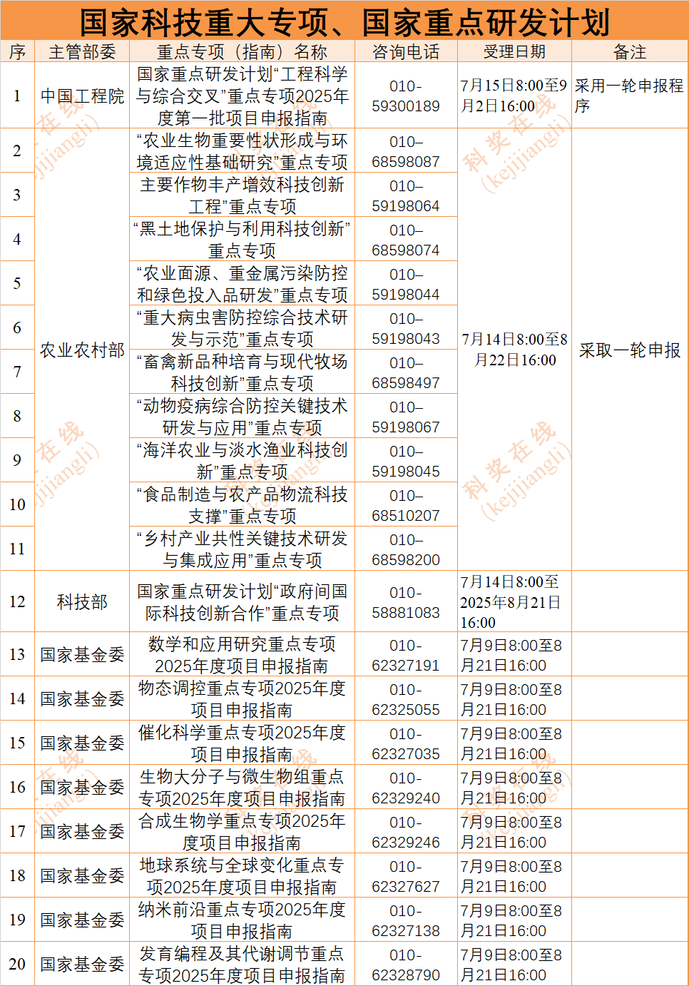 科技部、国家自然基金委,启动的2025年度各类科技项目汇总