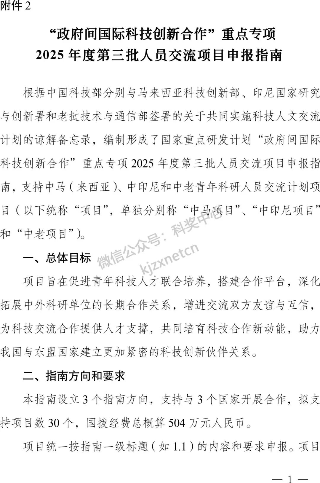 科技部发布“政府间国际科技创新合作”重点专项2025年度第三批人员交流项目申报指南