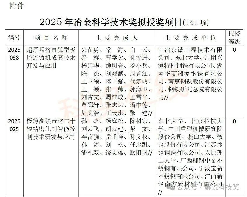 141项!2025年冶金科学技术奖评审委员会推荐获奖项目名单公布