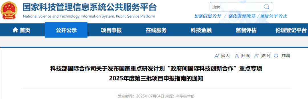 "近日,科技部“政府间国际科技创新合作”重点专项2025年度第三批项..."