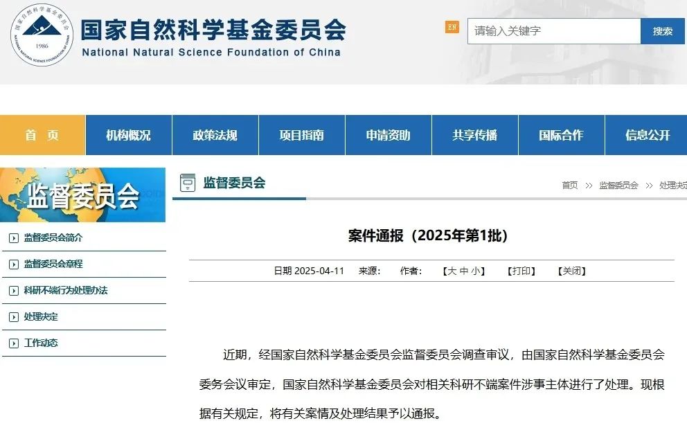 " 4月11日,国自然基金委官网发布 《案件通报(2025年第1批)》 ,通报202..."