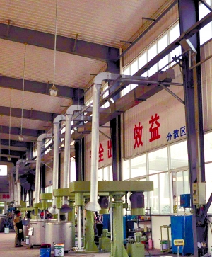 海洋防腐涂层新材料技术产品产业化基地近日落户江苏金陵特种涂料有限公司。该公司将与北京科技大学等单位进行产学研合作,共同研发可用于海上石油钻井平台、海底管道防腐的钛纳米高分子合金聚合物。图为公司工人正在生产特种涂料。 (本报记者 刘凯 摄)