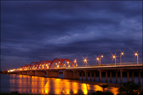 琼州大桥于2000 年12 月开工, 2003 年5 月建成通车。它是跨越南渡江上的一座特大型桥梁,全长1396.98m, 其中主桥长480m, 东引桥长452.74m,西引桥长464.24m。主桥为5 跨( 188m+98m+108m+98m+88m)下承式钢管混凝土系杆拱桥, 拱肋为钢管混凝土哑铃断面,下部结构为整体式钢筋混凝土薄壁空心墩,基础为钻孔灌注桩。引桥为连续箱梁和T 形梁。
