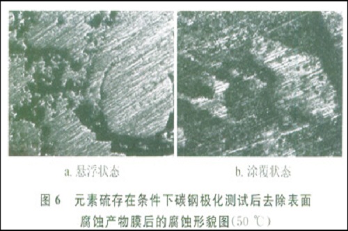 涂敷元素硫后,改变r极化曲线的形状,且腐蚀速率大大增加,阳极Tafel斜率增加,阴极也转为扩散控制。这是因为作为独立相的元素硫与硫化物覆盖的金属表面接触时,元素硫与金属之间的电子传递就更直接、迅速,有着更高的腐蚀速率。随着元素硫含量的增加,其腐蚀电流增加。