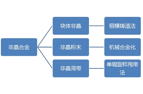 在非晶合金的开发方面,目前已在包括Pd、Pt、Au、Mg、Ca、Zr、Ti、Hf、Cu、Fe、Co、Ni、和稀土(如La、Nd、Ce)基等在内的数十种合金体系。目前非晶合金一共有非晶薄带、非晶粉末、块体非晶这几种形式,它们的制备方法可以简单归纳为: