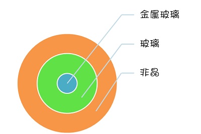 “玻璃”一般是特指熔体快速冷却得到的非晶体(换句话说,得到非晶体的方法可不止一种哦!还有气相沉积、机械合金化、激光制备等等)。这里所说的玻璃可千万不要和窗户玻璃对等哦,它的含义可比我们日常生活中看到的窗户玻璃可要广多了。而金属玻璃,则是由合金熔体经过快速冷却的方式制备得来,一类特殊的玻璃。他们的内涵在一步步的缩小,可以用下面这个示意图来表示: