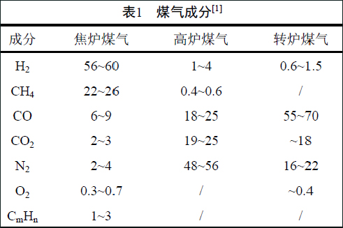 各种煤气成分如表1所示,其中焦炉煤气的可燃成分种类较多,除H2和CH4外,还有少量的CO和CmHn,热值较其他两种煤气也大很多,而高炉煤气和转炉煤气的主要可燃成分均为CO,转炉煤气中CO含量较高,因此其毒性在三种煤气中也最大。