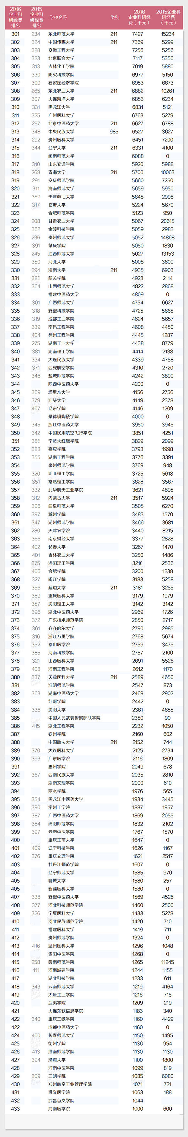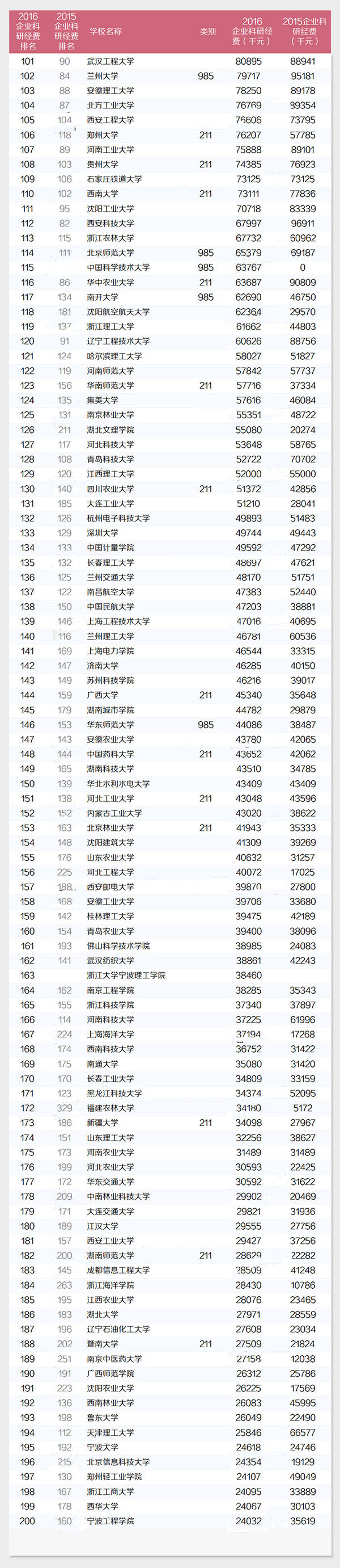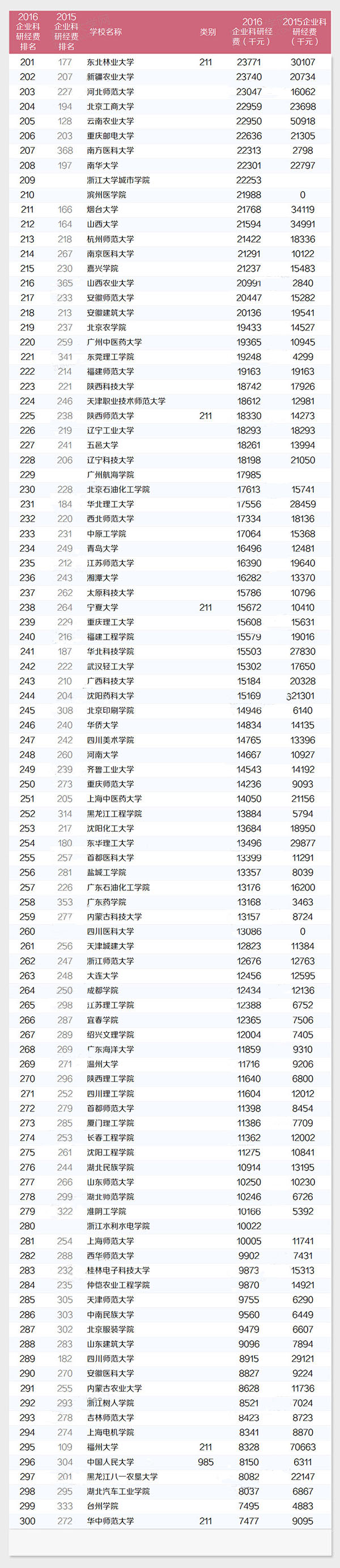 纵观今年高校企业科研经费名单,企业科研经费额的变化也比较大,去年企业科研经费达10亿元以上的,只有1所高校(10.5亿元),而2016年企业科研经费超过10亿元的高校达到5所,最高经费达14.03亿元。企业科研经费作为衡量高校服务社会的重要指标之一,这一可喜增长,预示着高校与企业社会的协作在增强。