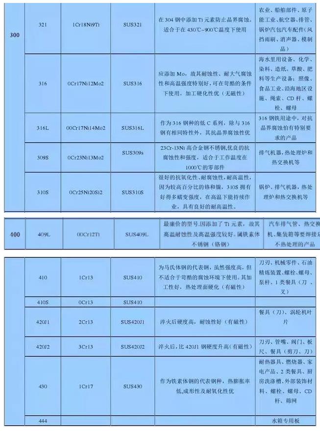 1、304不锈钢。是应用量较大、使用范围最广的奥氏体不锈钢之一,适用于制造深冲成型部件和输酸管道、容器、结构件、各类仪表本体等,也可以制造无磁、低温设备和部件。