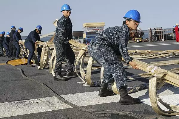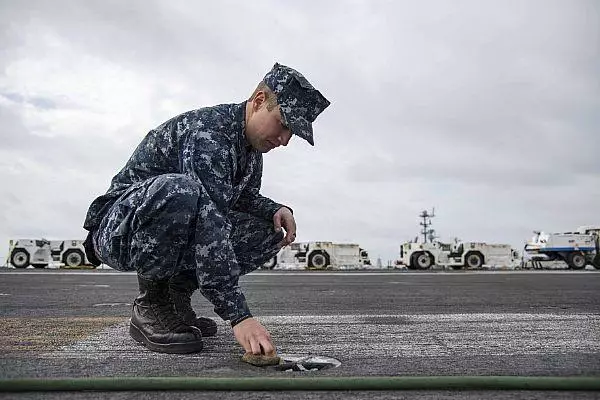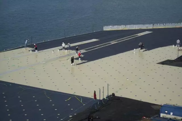 美国航母卡尔文森号正在铺飞行甲板涂层