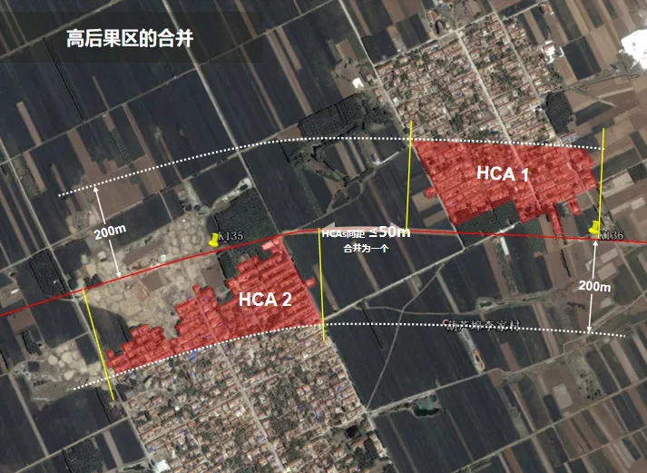 高后果区的合并与拆分:当高后果区的区段相互重叠或相隔不超过50m时,作为一个高后果区段管理,避免出现高后果区过于琐碎的情况。