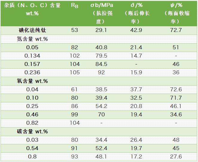 钛中的杂质含量对钛的力学性能影响很大,杂质含量增多,可以提高其强度而降低塑性。氧、碳、氮是钛中经常存在的杂质,它们能提高钛的强度而降低其塑性,其中氮的影响最大,碳最小。