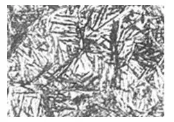 b. 针状马氏体是含碳量较高的钢淬火后得到的组织。在光学显微镜下,它呈竹叶状或针状,针与针之间成一定的角度。最先形成的马氏体较粗大,往往横穿整个奥氏体晶粒,将奥氏体晶粒加以分割,使以后形成的马氏体片的大小受到限制。因此,针状马氏体的大小不一。同时有些马氏体有一条中脊线,并在马氏体周围有残留奥氏体。针状马氏体的硬度高而韧性差。