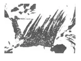a. 上贝氏体是由成束平行排列的条状铁素体和条间断续分布的渗碳体所组成的非层状组织。当转变量不多时,在光学显微镜下为成束的铁素体条向奥氏体晶内伸展,具有羽毛状特征。在电镜下,铁素体以几度到十几度的小位向差相互平行,渗碳体则沿条的长轴方向排列成行,(如图3-5)。