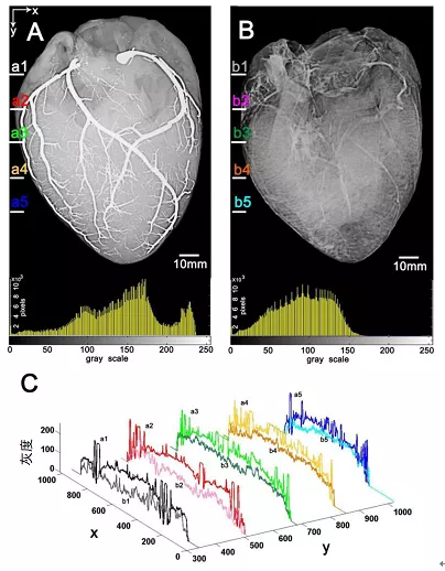 图4 液态金属高分辨血管造影术。镓造影剂(A)与传统碘海醇造影剂(B)的猪心脏冠状动脉毛细管成像情况对比及灰度差(C)。
