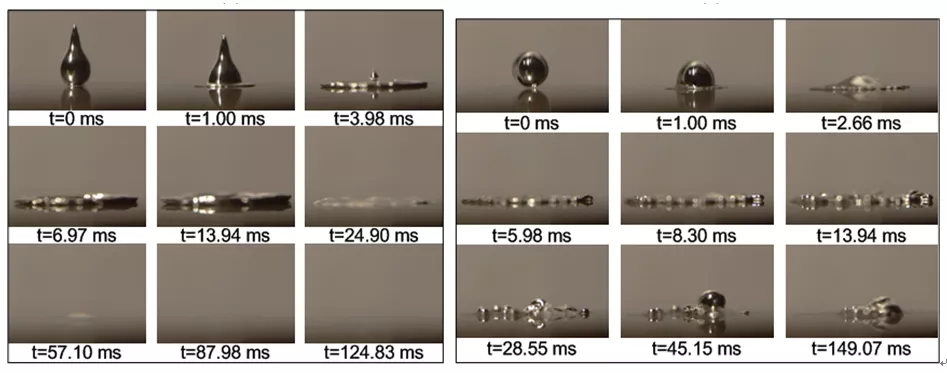 图1 镓基液态金属液滴(左)及其外覆水膜(右)时撞击钢板基底的动态情形